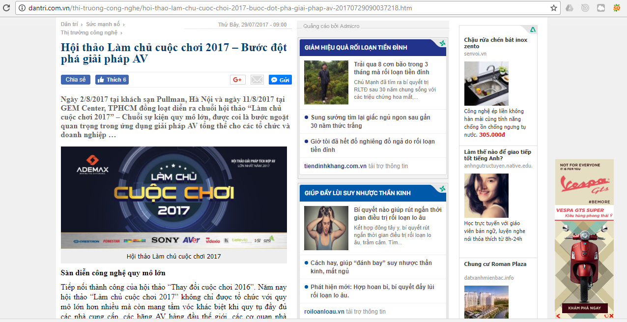 Nội dung bài viết điểm qua các thông tin chính về chương trình hội thảo cũng như nêu bật thông điệp mà các diễn giả và Ban tổ chức muốn hướng tới trong hội thảo – cách thức “Làm chủ cuộc chơi” trong lĩnh vực AV tại Việt Nam. Đồng thời cũng đưa tin về sự quy tụ của 10 hãng AV hàng đầu thế giới trong hội thảo LÀM CHỦ CUỘC CHƠI 2017 như Sony, Aver, Fonestar, Crestron, DP,Camera Sony Bosch, Televic, Kramer, SI, GPO… các cơ quan nhà nước cùng đông đảo các đại lý, các đơn vị, tổ chức, doanh nghiệp trong và ngoài nước.