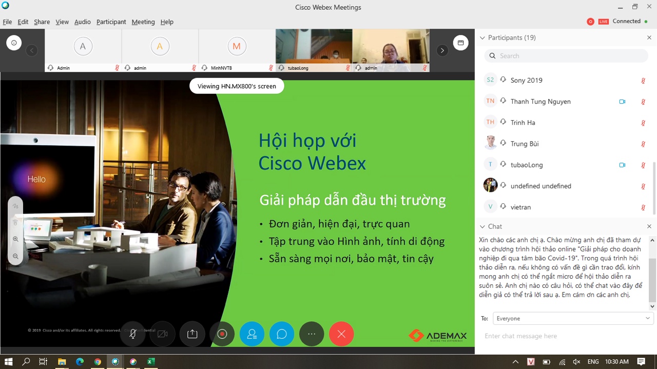 Hội thảo trực tuyến “Giải pháp Hội họp hiệu quả với Cisco Webex” diễn ra ngày 5/3/2020 tại công ty Ademax. Chất lượng video chuẩn HD trên mọi thiết bị điện thoại thông minh, máy tính bảng, laptop…