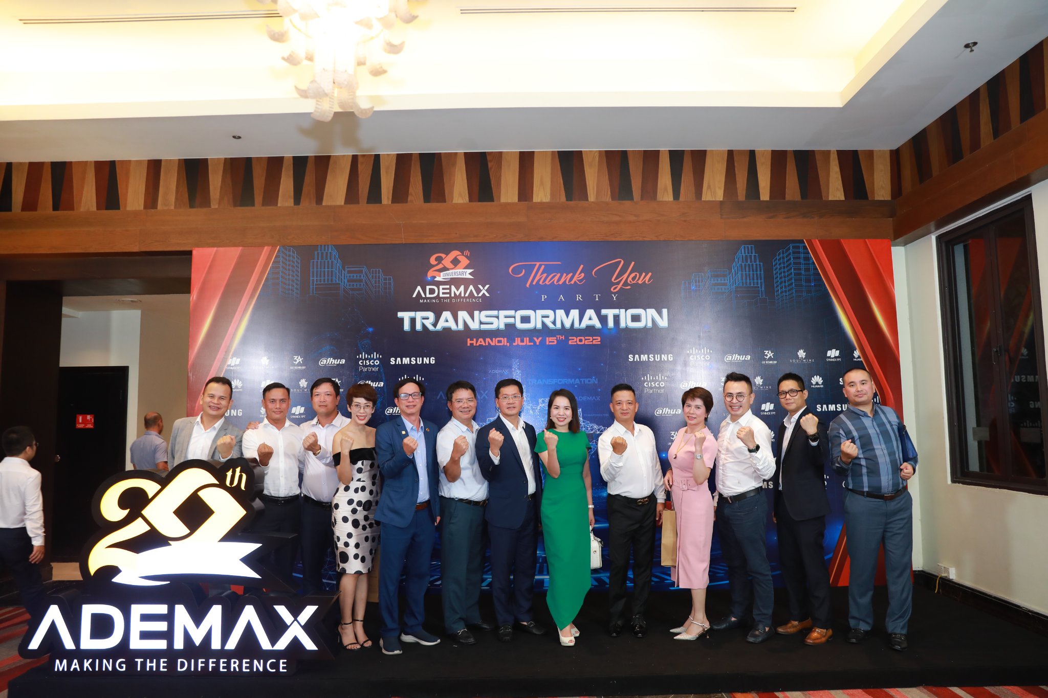 Đêm tiệc ” Ademax 20 Transformation – Thank You Party” đã diễn ra tối 15/7 tại Hà Nội gần 200 khách hàng thân thiết và đối tác từ các đơn vị thuộc Bộ Công an, Bộ Lao động, Bộ Giao thông vận tải, các Thành uỷ và UBND, sở Du lịch và Cảng Hải Phòng, Hội Doanh nghiệp trẻ Hà Nội… Bên cạnh tri ân hệ thống khách hàng và đối tác đã đồng hành cùng Ademax, đây cũng là sự kiện kỷ niệm 20 năm thành lập Ademax. Đồng hành cùng Ademax trong sự kiện là các nhà tài trợ Samsung, Cisco, Dahua, Synnex FPT, Led 3A và Soul Wine.