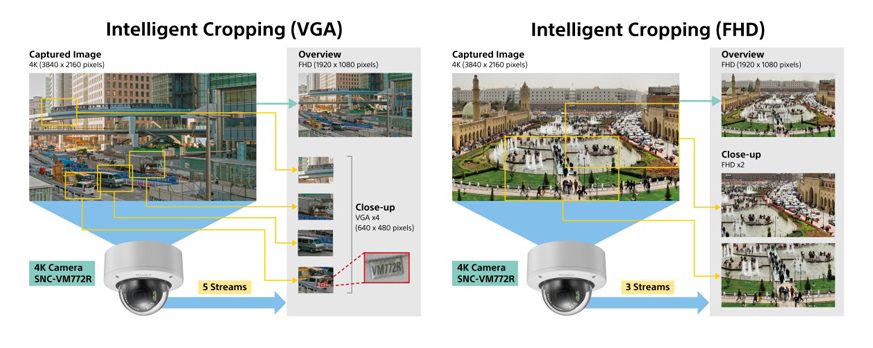 Sony SNC-VM772R, đại diện mới từ thế hệ gen 7 có thể hỗ trợ nhiều chức năng theo dõi đồng thời và mã hóa thông minh. Ở chế độ cắt, người dùng có thể chọn các đối tượng chuyển động (người đi bộ, phương tiện di chuyển)để theo dõi trong từng chế độ xem chia tách. Với chức năng này, chỉ cần 1 camera để theo dõi nhiều đối tượng cùng lúc thay vì phải sử dụng nhiều camera PTZ để theo dõi nhiều đối tượng như trước đây.