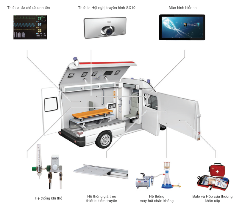 Mô hình xe cứu thương trang bị Telemedicine. Với sự phát triển mạnh mẽ của viễn thông với công nghệ 4G và sắp tới là 5G, xe cứu thương được trang bị các thiết bị y tế cần thiết tích hợp cùng thiết bị hội nghị truyền hình sẽ giúp rút ngắn thời gian, cũng như cập nhật tình trạng bệnh nhân nhanh chóng.