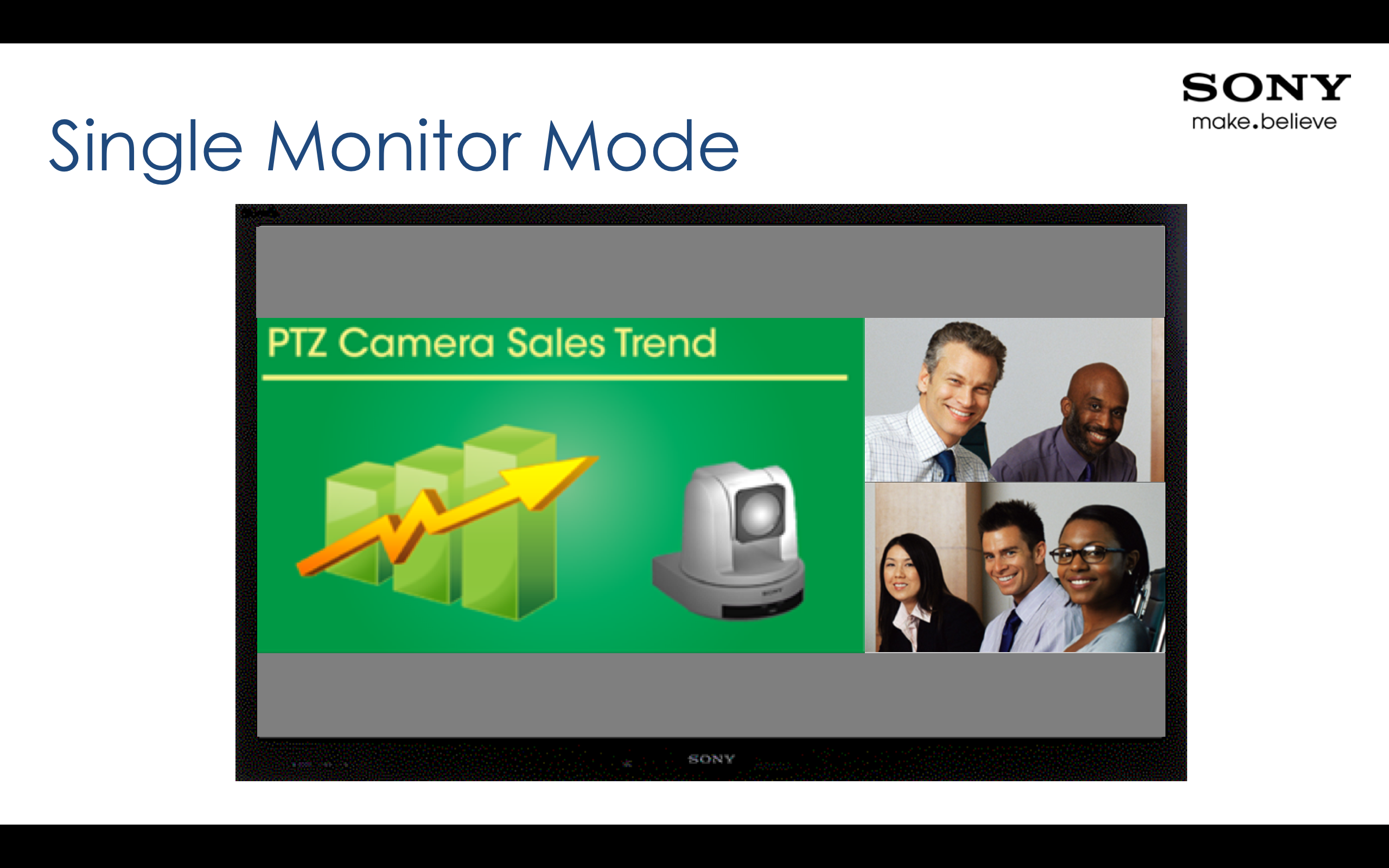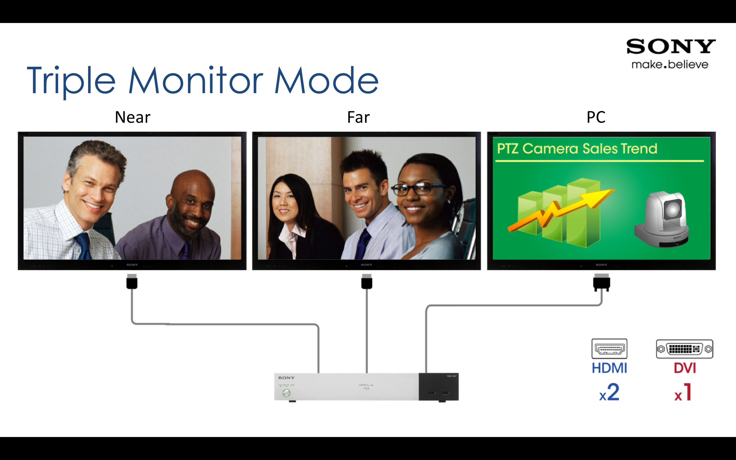 Chỉ có trên thiết bị của Sony PCS-XG100 với chế độ 3 màn hình hiển thị bao gồm hình ảnh đầu gần, đầu xa và nội dung, thiết bị được tích hợp 2 cổng HDMI và 1 cổng DVI. Trong trường hợp có một màn hình thì nội dung hiển thị vẫn được phân bổ để hiển thị đầy đủ các nội dung và phần hình ảnh.