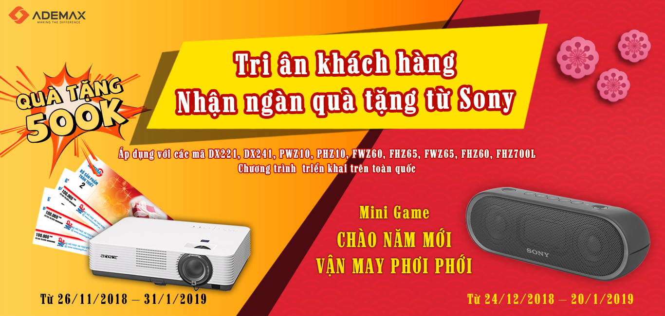 Nhân dịp cuối năm, Công ty Cổ phần Ademax triển khai chương trình Tri ân khách hàng với quà tặng giá trị và hấp dẫn khi mua các sản phẩm máy chiếu laser dòng P hoặc dòng F của Sony.